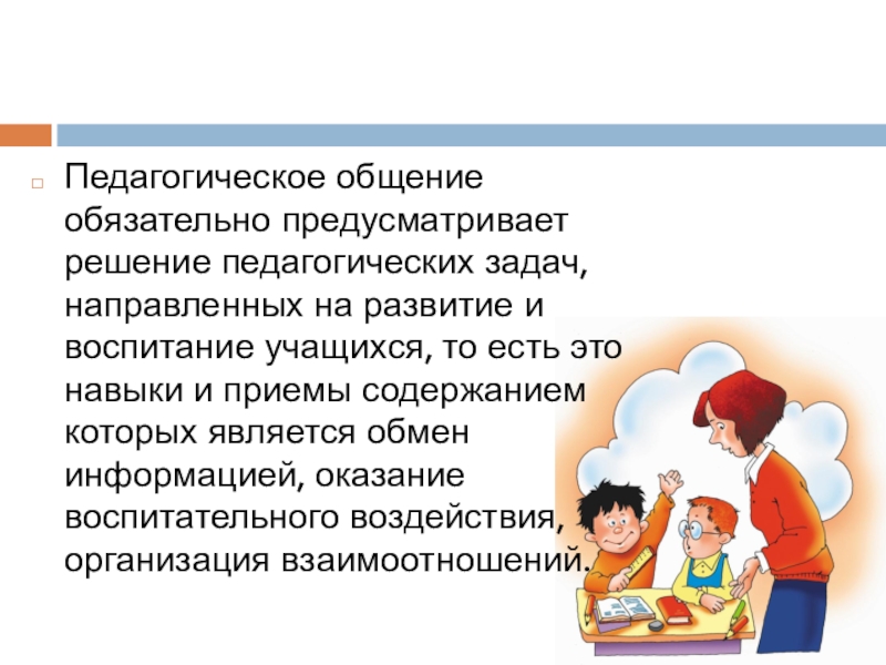 Слайд 7Педагогическое общение обязательно предусматривает решение педагогических задач, направленных на развитие и