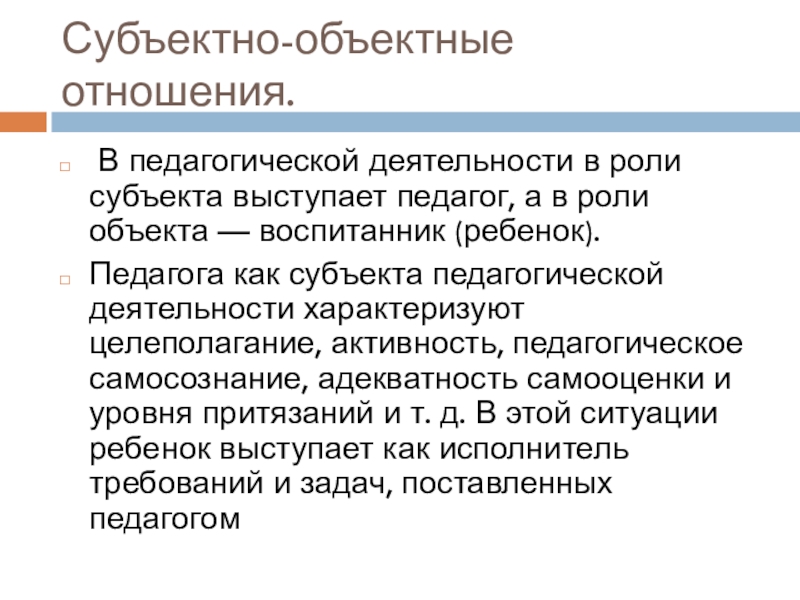 Педагога как субъекта педагогической деятельности характеризуют целеполагание, активность, педагогическое самосознание, адекватность самооценки и уровня притязаний и т. д. В этой ситуации ребенок выступает как исполнитель требований и задач, поставленных педагогом