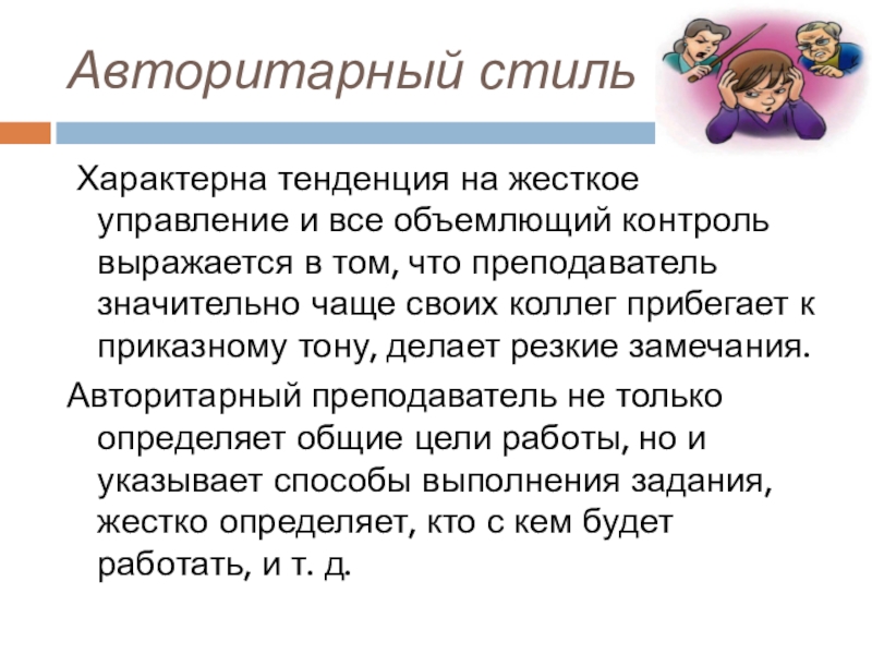 Авторитарный преподаватель не только определяет общие цели работы, но и указывает способы выполнения задания, жестко определяет, кто с кем будет работать, и т. д.