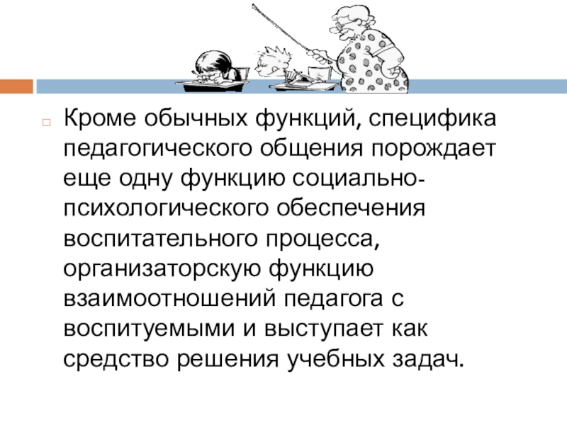 Слайд 5Кроме обычных функций, специфика педагогического общения порождает еще одну функцию социально-психологического