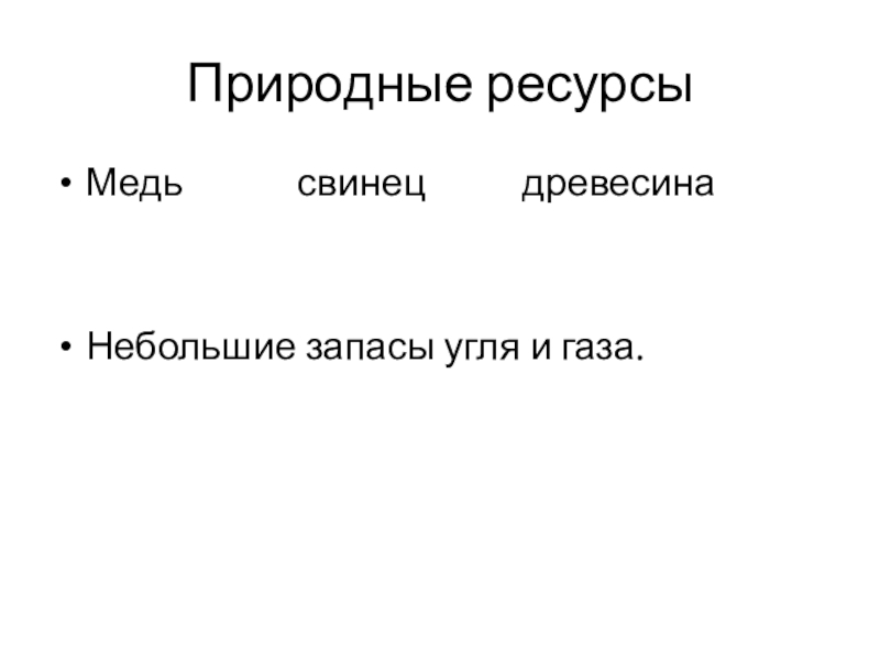 Природные ресурсыМедь       свинец      древесинаНебольшие запасы угля