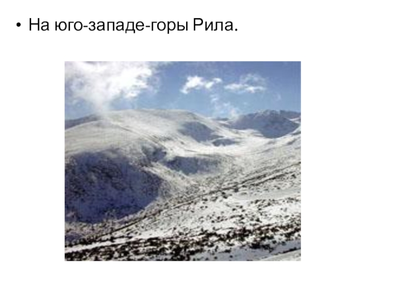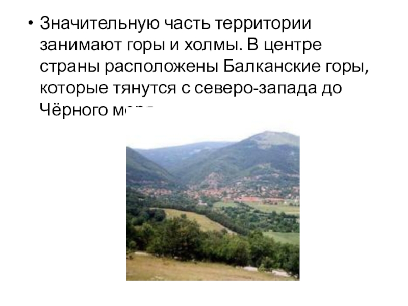 Значительную часть территории занимают горы и холмы. В центре страны расположены Балканские горы, которые тянутся с северо-запада