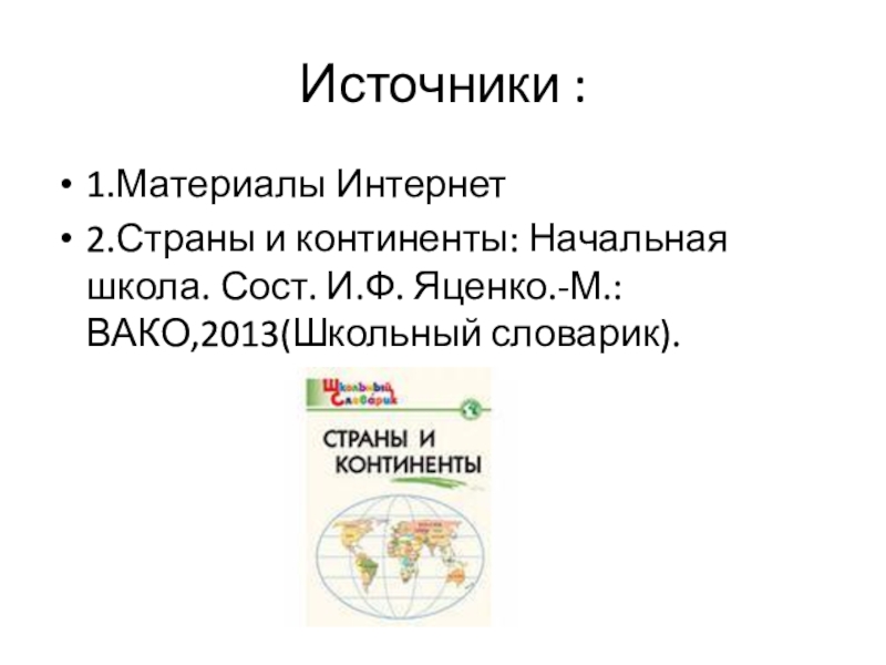 Источники :1.Материалы Интернет2.Страны и континенты: Начальная школа. Сост. И.Ф. Яценко.-М.: ВАКО,2013(Школьный словарик).