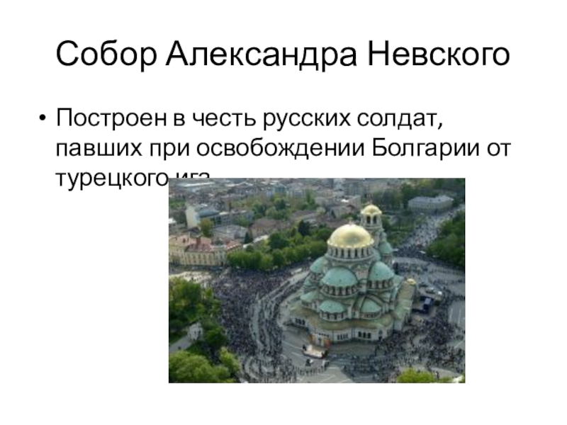 Собор Александра НевскогоПостроен в честь русских солдат, павших при освобождении Болгарии от турецкого ига.