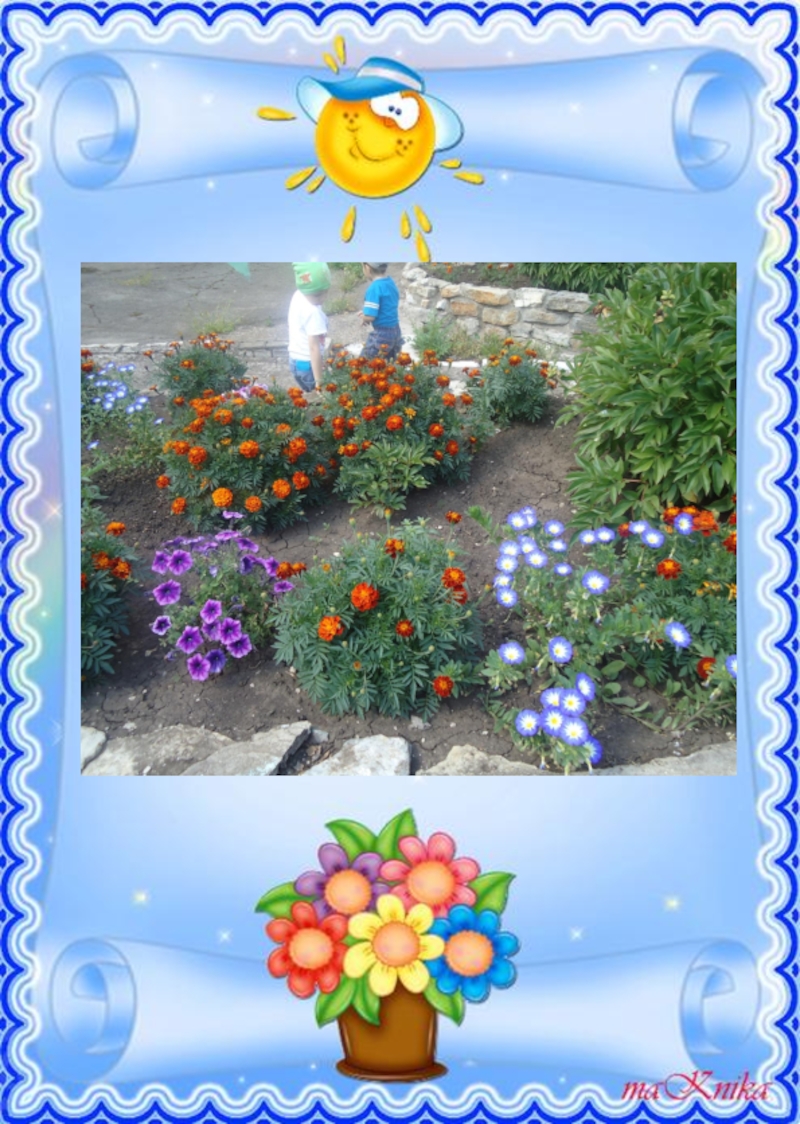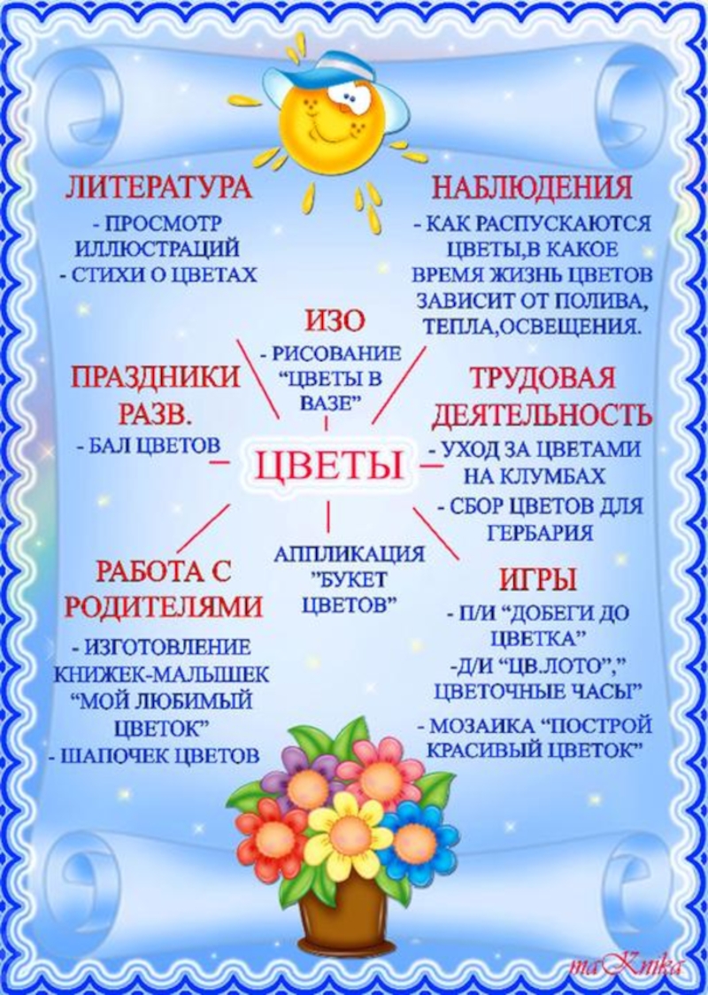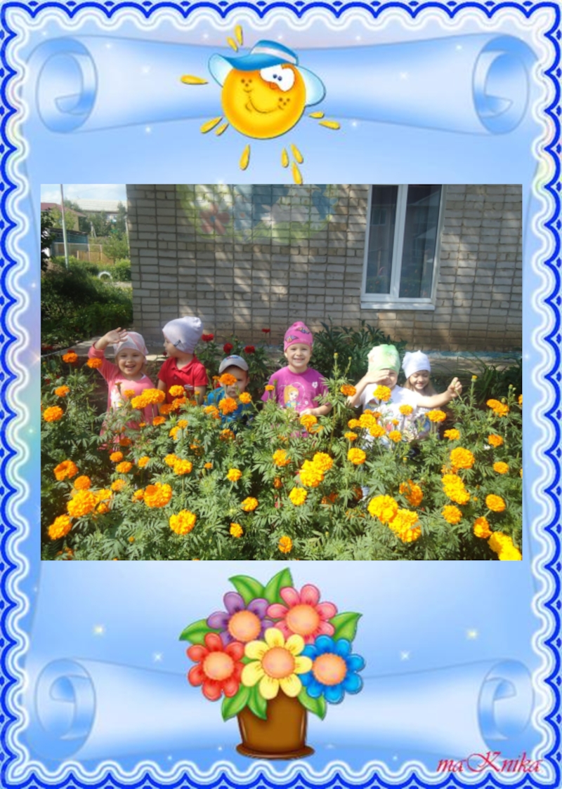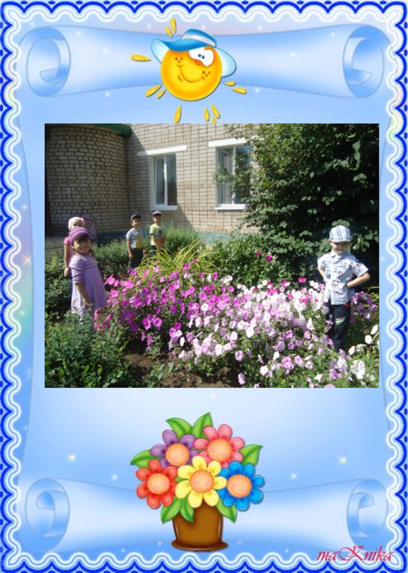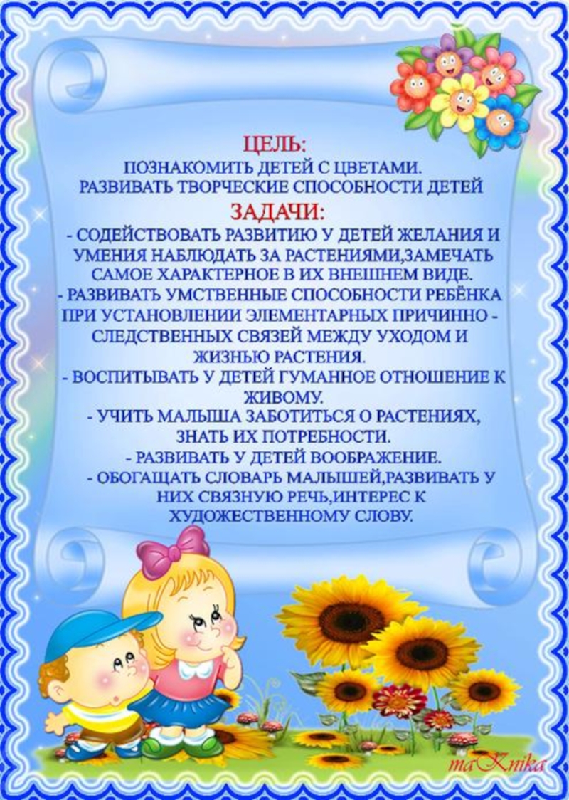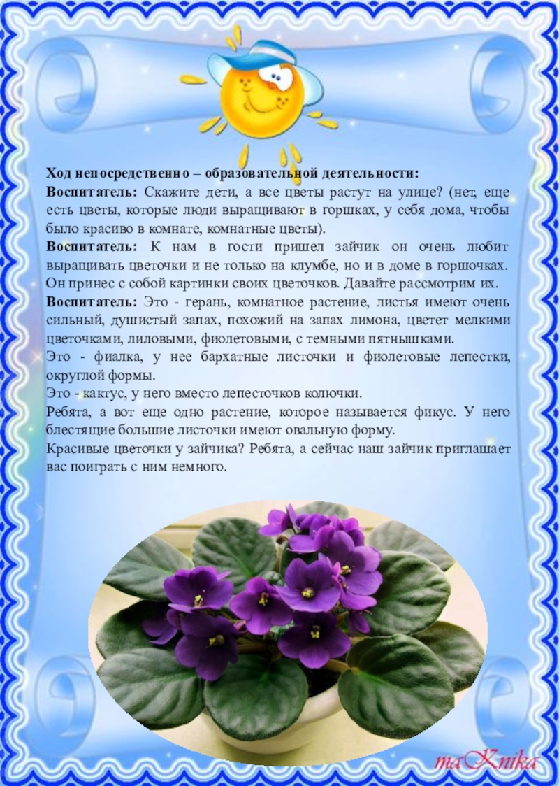 Воспитатель: К нам в гости пришел зайчик он очень любит выращивать цветочки и не только на клумбе, но и в доме в горшочках. Он принес с собой картинки своих цветочков. Давайте рассмотрим их.
