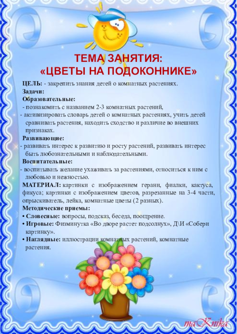 МАТЕРИАЛ: картинки с изображением герани, фиалки, кактуса, фикуса; картинки с изображением цветов, разрезанные на 3-4 части, опрыскиватель, лейка, комнатные цветы (2 разных).