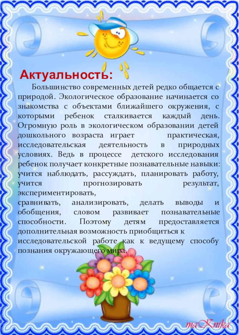со знакомства с объектами ближайшего окружения, с которыми ребенок сталкивается каждый день. Огромную роль в экологическом образовании детей дошкольного возраста играет практическая, исследовательская деятельность в природных условиях. Ведь в процессе детского исследования ребенок получает конкретные познавательные навыки: учится наблюдать, рассуждать, планировать работу, учится прогнозировать результат, экспериментировать,