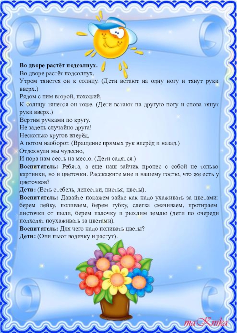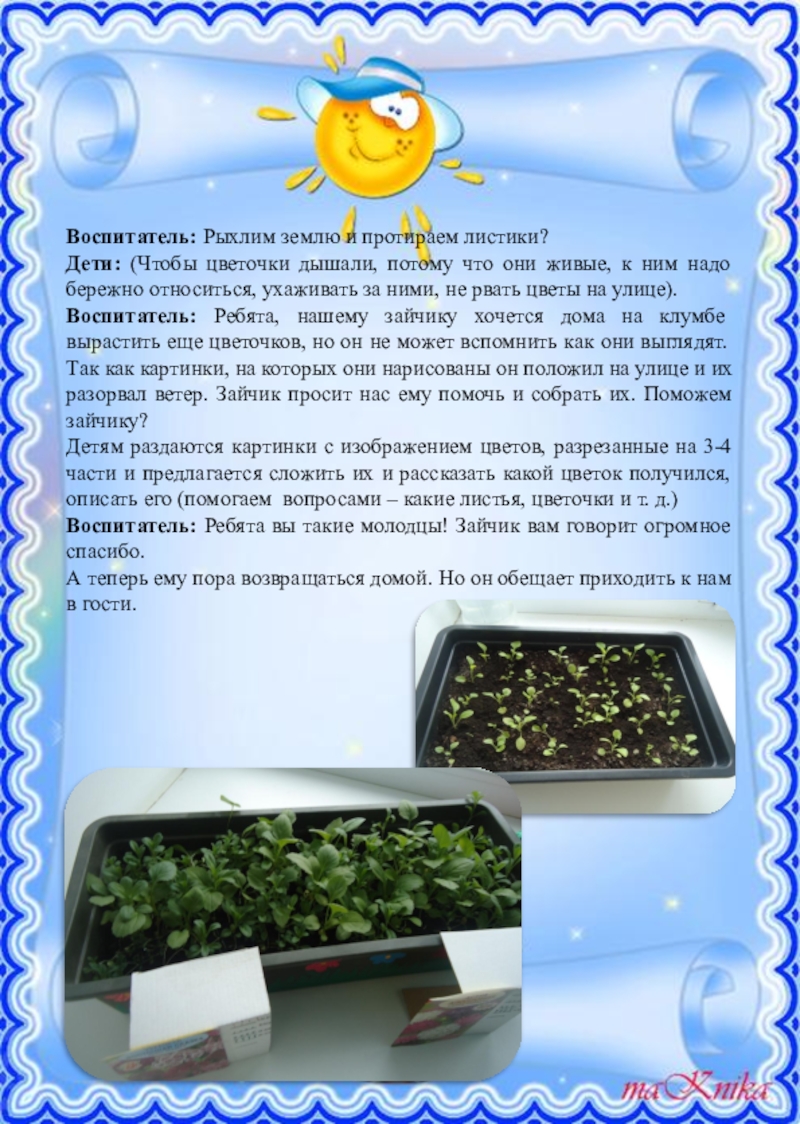 Воспитатель: Давайте покажем зайке как надо ухаживать за цветами: берем лейку, поливаем, берем губку, слегка смачиваем, протираем листочки от пыли, берем палочку и рыхлим землю (дети по очереди подходят поухаживать за цветами).