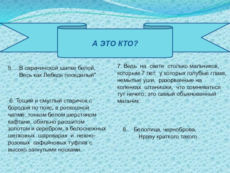6. Тощий и смуглый старичок с бородой по пояс, в роскошной чалме, тонком белом шерстяном кафтане, обильно расшитом золотом и серебром, в белоснежных шелковых шароварах и нежно-розовых сафьяновых туфлях с высоко загнутыми носками.
