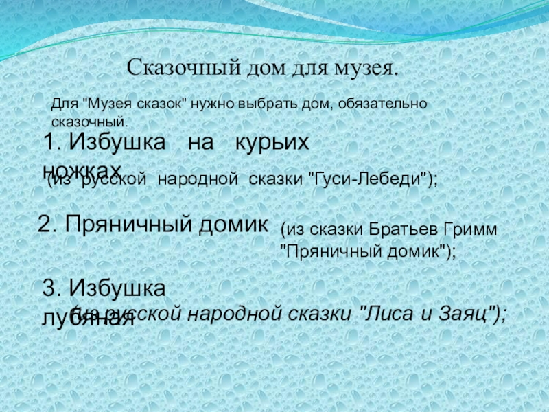 Для "Музея сказок" нужно выбрать дом, обязательно сказочный.