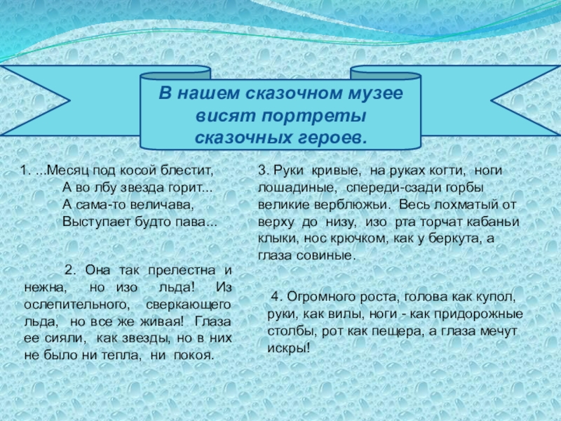 3. Руки кривые, на руках когти, ноги лошадиные, спереди-сзади горбы великие верблюжьи. Весь лохматый от верху до низу, изо рта торчат кабаньи клыки, нос крючком, как у беркута, а глаза совиные.