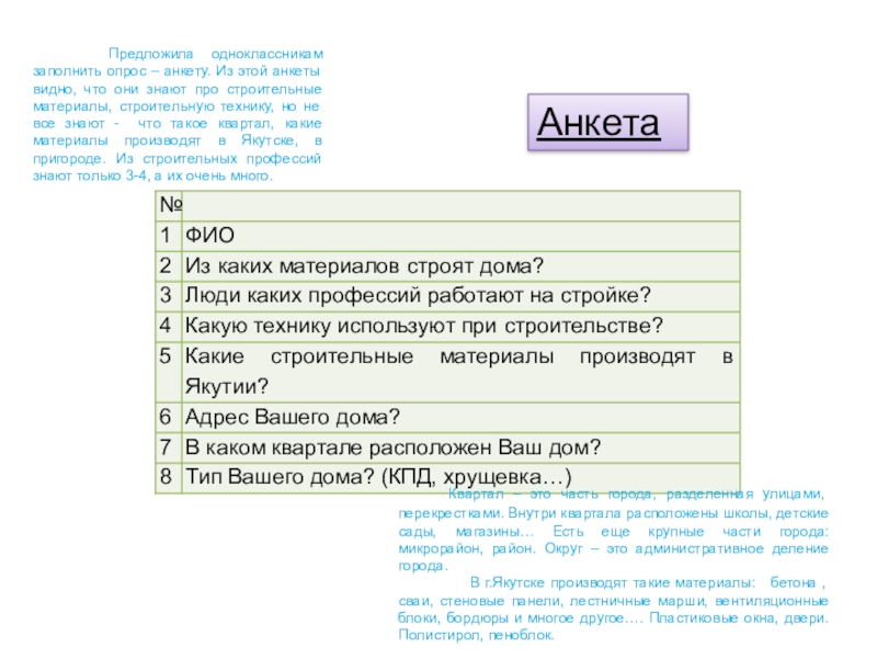 Квартал – это часть города, разделенная улицами, перекрестками. Внутри квартала расположены школы, детские сады, магазины… Есть еще крупные части города: микрорайон, район. Округ – это административное деление города.