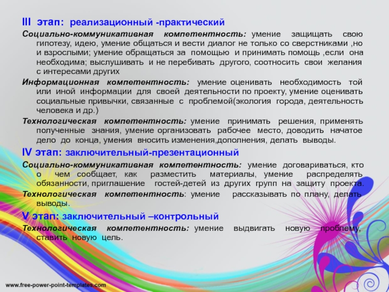 Социально-коммуникативная компетентность: умение договариваться, кто о чем сообщает, как разместить материалы, умение распределять обязанности, приглашение гостей-детей из других групп на защиту проекта.