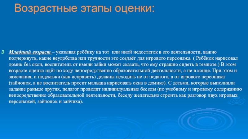 недостаток в его деятельности, важно подчеркнуть, какие неудобства или трудности это создаёт для игрового персонажа. ( Ребёнок нарисовал домик без окон, воспитатель от имени зайки может сказать, что ему страшно сидеть в темноте.) В этом возрасте оценка идёт по ходу непосредственно образовательной деятельности, а не в конце. При этом и замечания, и подсказки (как исправить) должны исходить не от педагога, а от игрового персонажа (зайчонок, а не воспитатель просит малыша нарисовать окна в домике). С детьми, которые выполнили задание раньше других, педагог проводит индивидуальные беседы (по учебному и игровому содержанию непосредственно образовательной деятельности, беседу желательно строить как разговор двух игровых персонажей, зайчонок и зайчиха).