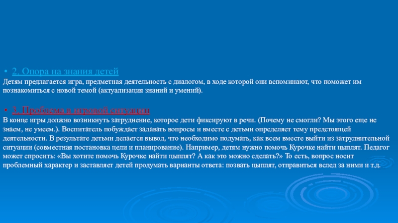 В конце игры должно возникнуть затруднение, которое дети фиксируют в речи. (Почему не смогли? Мы этого еще не знаем, не умеем.). Воспитатель побуждает задавать вопросы и вместе с детьми определяет тему предстоящей деятельности. В результате детьми делается вывод, что необходимо подумать, как всем вместе выйти из затруднительной ситуации (совместная постановка цели и планирование). Например, детям нужно помочь Курочке найти цыплят. Педагог может спросить: «Вы хотите помочь Курочке найти цыплят? А как это можно сделать?» То есть, вопрос носит проблемный характер и заставляет детей продумать варианты ответа: позвать цыплят, отправиться вслед за ними и т.д.