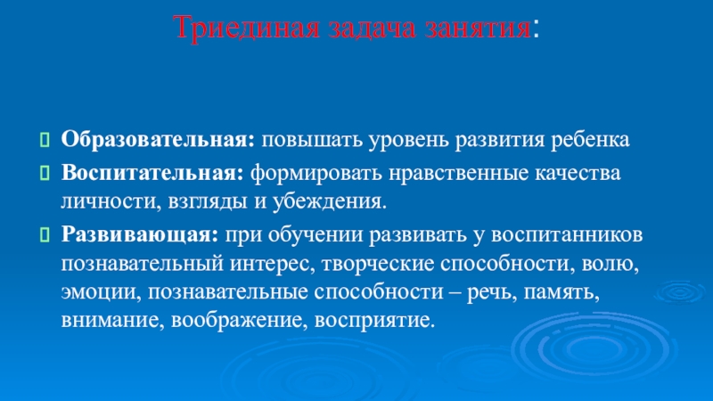 Развивающая: при обучении развивать у воспитанников познавательный интерес, творческие способности, волю, эмоции, познавательные способности – речь, память, внимание, воображение, восприятие.