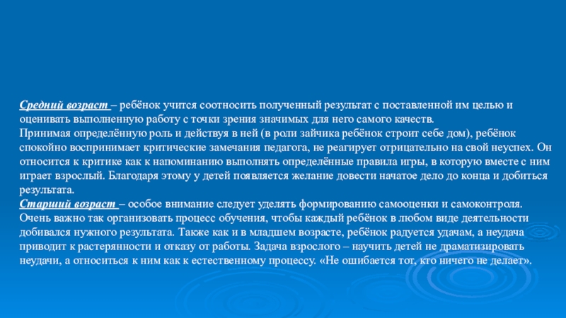 Старший возраст – особое внимание следует уделять формированию самооценки и самоконтроля. Очень важно так организовать процесс обучения, чтобы каждый ребёнок в любом виде деятельности добивался нужного результата. Также как и в младшем возрасте, ребёнок радуется удачам, а неудача приводит к растерянности и отказу от работы. Задача взрослого – научить детей не драматизировать неудачи, а относиться к ним как к естественному процессу. «Не ошибается тот, кто ничего не делает».