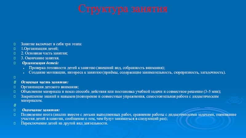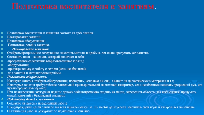 Подготовка воспитателя к занятиям состоит из трёх этапов: