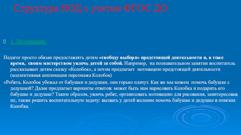 детям «свободу выбора» предстоящей деятельности и, в тоже время, своим мастерством увлечь детей за собой. Например, на познавательном занятии воспитатель рассказывает детям сказку «Колобок», а потом предлагает мотивацию предстоящей деятельности (коллективная аппликация персонажа Колобок)