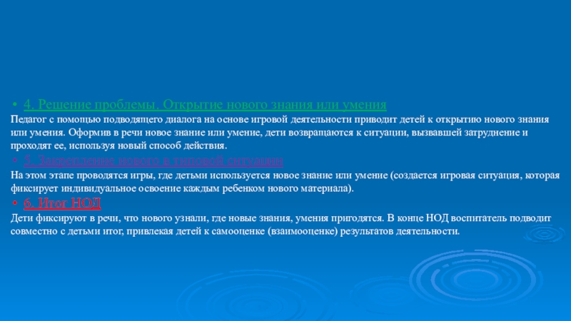 диалога на основе игровой деятельности приводит детей к открытию нового знания или умения. Оформив в речи новое знание или умение, дети возвращаются к ситуации, вызвавшей затруднение и проходят ее, используя новый способ действия.
