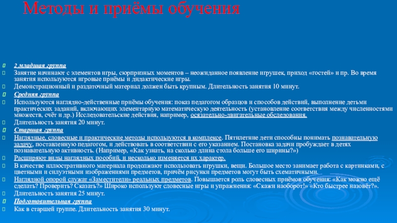 моментов – неожиданное появление игрушек, приход «гостей» и пр. Во время занятия используются игровые приёмы и дидактические игры.