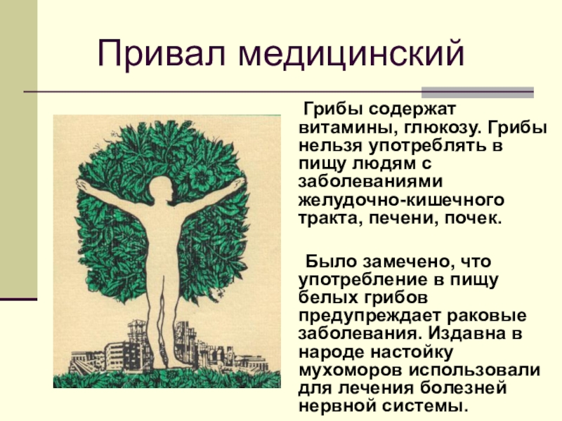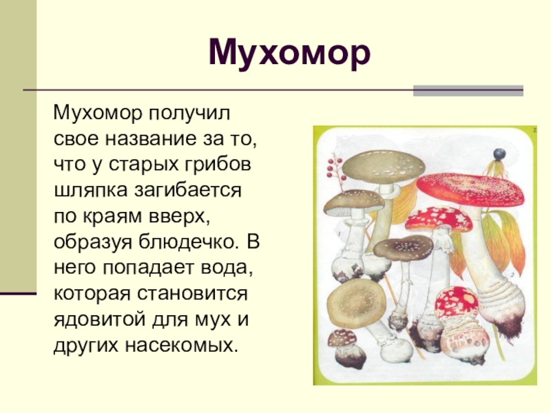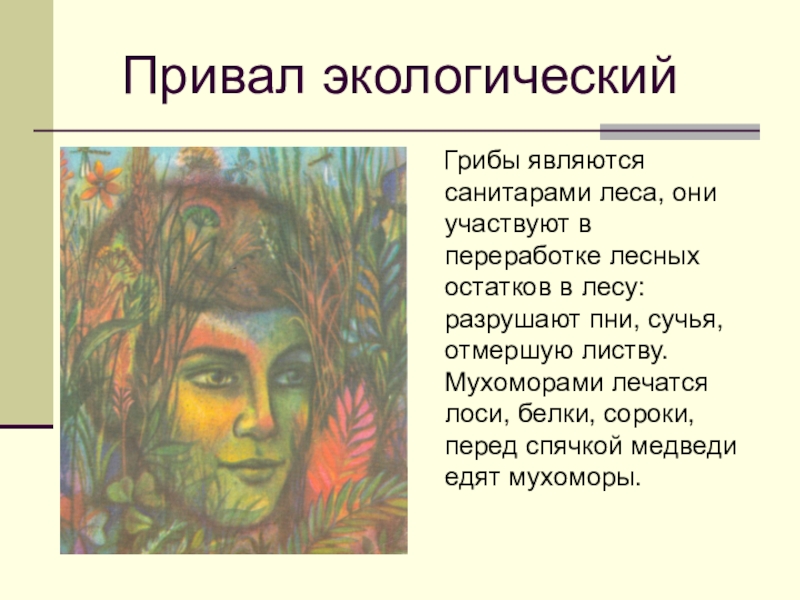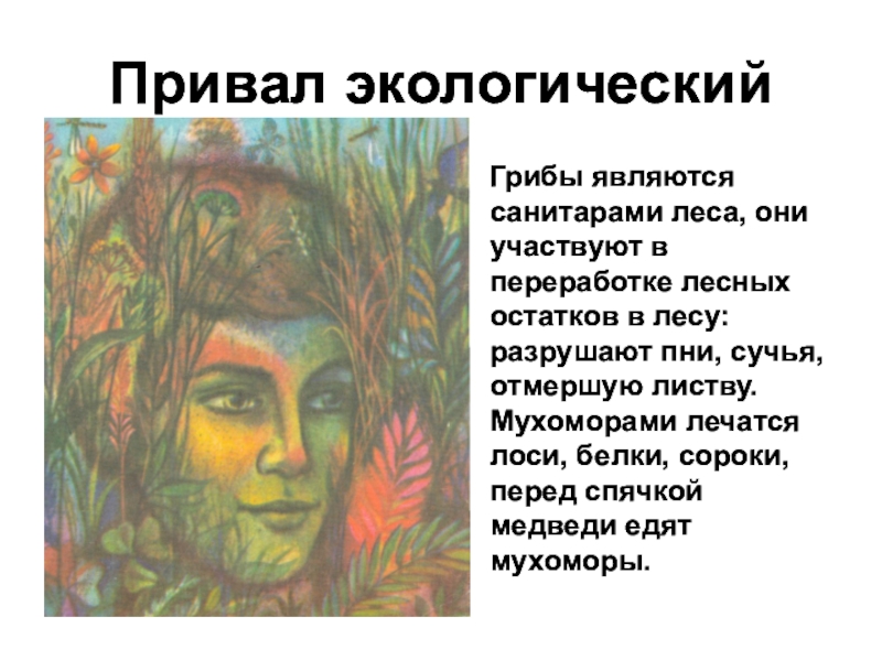 Грибы являются санитарами леса, они участвуют в переработке лесных остатков в лесу: разрушают пни, сучья, отмершую листву. Мухоморами лечатся лоси, белки, сороки, перед спячкой медведи едят мухоморы.