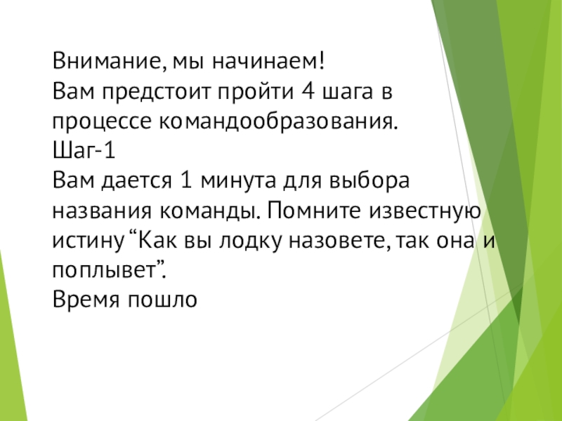 1 минута для выбора названия команды. Помните известную истину “Как вы лодку назовете, так она и поплывет”.