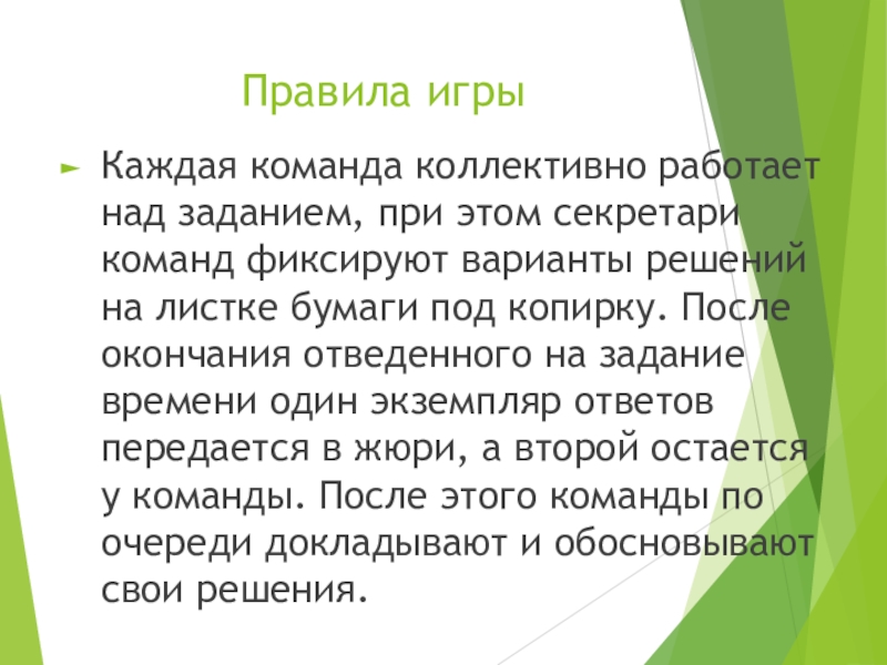 работает над заданием, при этом секретари команд фиксируют варианты решений на листке бумаги под копирку. После окончания отведенного на задание времени один экземпляр ответов передается в жюри, а второй остается у команды. После этого команды по очереди докладывают и обосновывают свои решения.