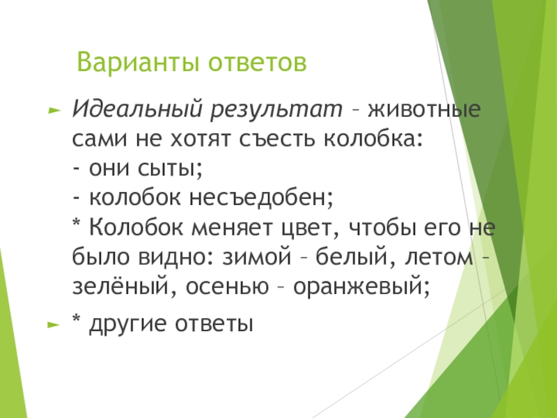 * Колобок меняет цвет, чтобы его не было видно: зимой – белый, летом – зелёный, осенью – оранжевый;