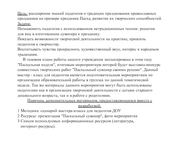 В годовом плане работы нашего учреждения запланирована в этом году "Пасхальная неделя", итоговым мероприятием которой будет выставка-конкурс совместных творческих работ "Пасхальный сувенир своими руками". Данный мастер - класс для педагогов является подготовительным мероприятием по организации образовательной работы в группах по данной тематической неделе. Так же материалы данного мероприятия могут быть использованы педагогами как в организации творческой деятельности с детьми старшего дошкольного возраста, так и в работе с родителями.