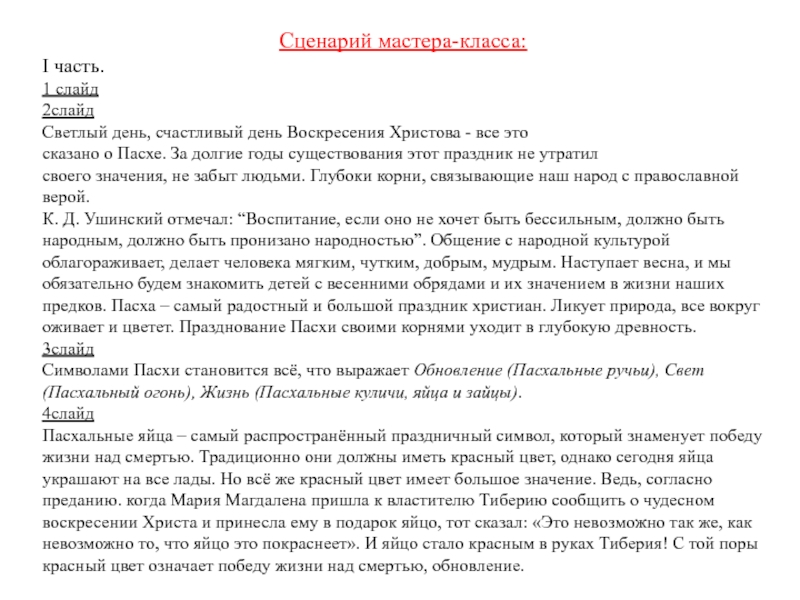 отмечал: “Воспитание, если оно не хочет быть бессильным, должно быть народным, должно быть пронизано народностью”. Общение с народной культурой облагораживает, делает человека мягким, чутким, добрым, мудрым. Наступает весна, и мы обязательно будем знакомить детей с весенними обрядами и их значением в жизни наших предков. Пасха – самый радостный и большой праздник христиан. Ликует природа, все вокруг оживает и цветет. Празднование Пасхи своими корнями уходит в глубокую древность.