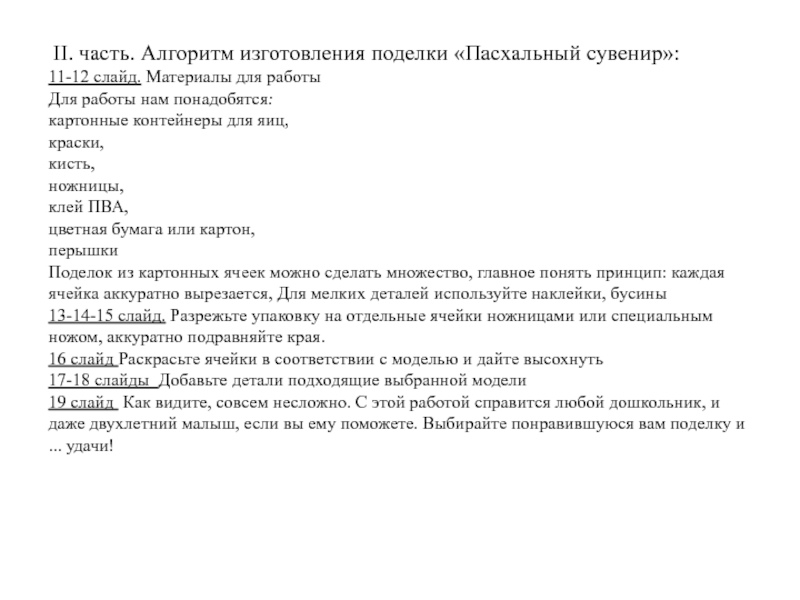 Слайд 5 II. часть. Алгоритм изготовления поделки «Пасхальный сувенир»: