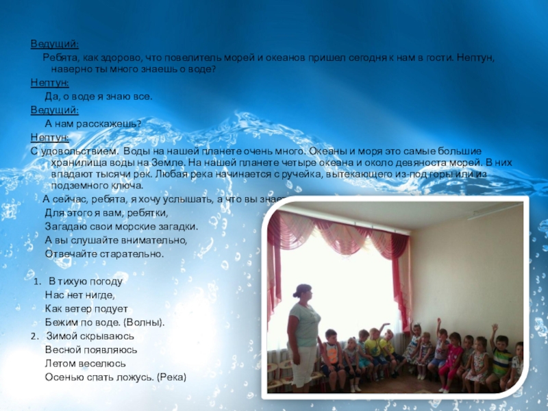 А сейчас, ребята, я хочу услышать, а что вы знаете о воде.