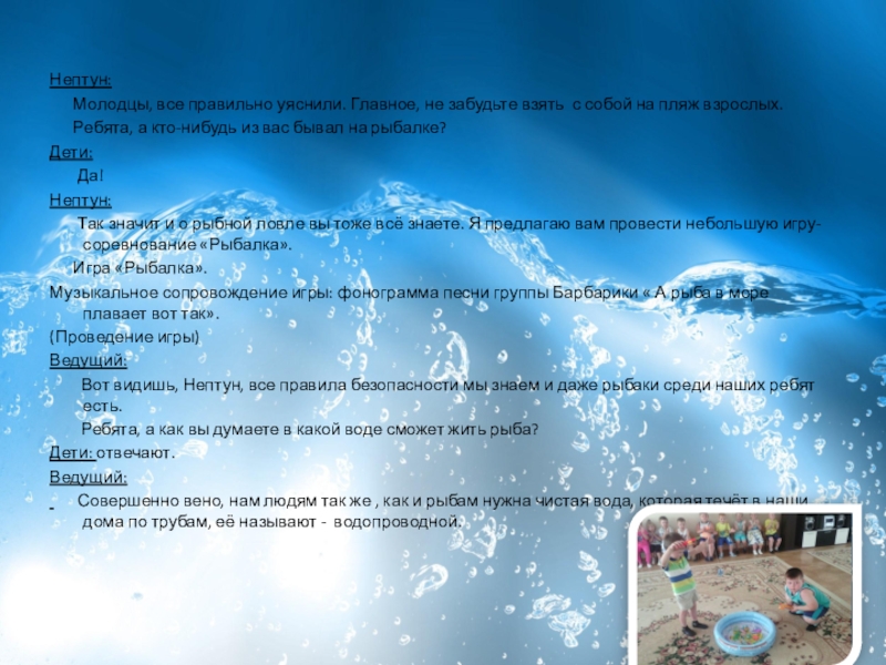 Вот видишь, Нептун, все правила безопасности мы знаем и даже рыбаки среди наших ребят есть.