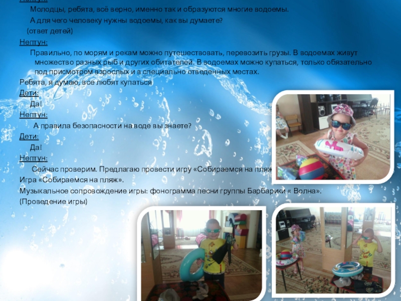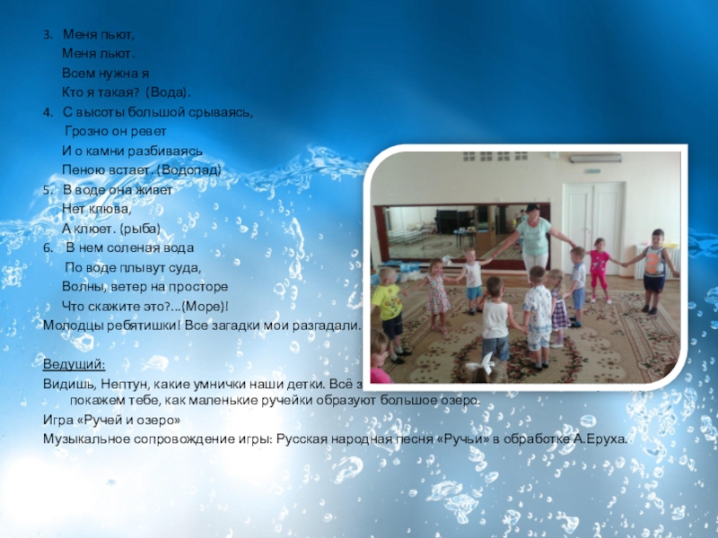 Видишь, Нептун, какие умнички наши детки. Всё знают. А сейчас мы поиграем в веселую игру, и покажем тебе, как маленькие ручейки образуют большое озеро.