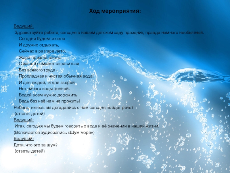 Итак, сегодня мы будем говорить о воде и её значении в нашей жизни.