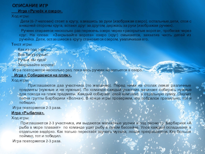 Игра повторяется несколько раз, пока весь ручеек не вольется в озеро.