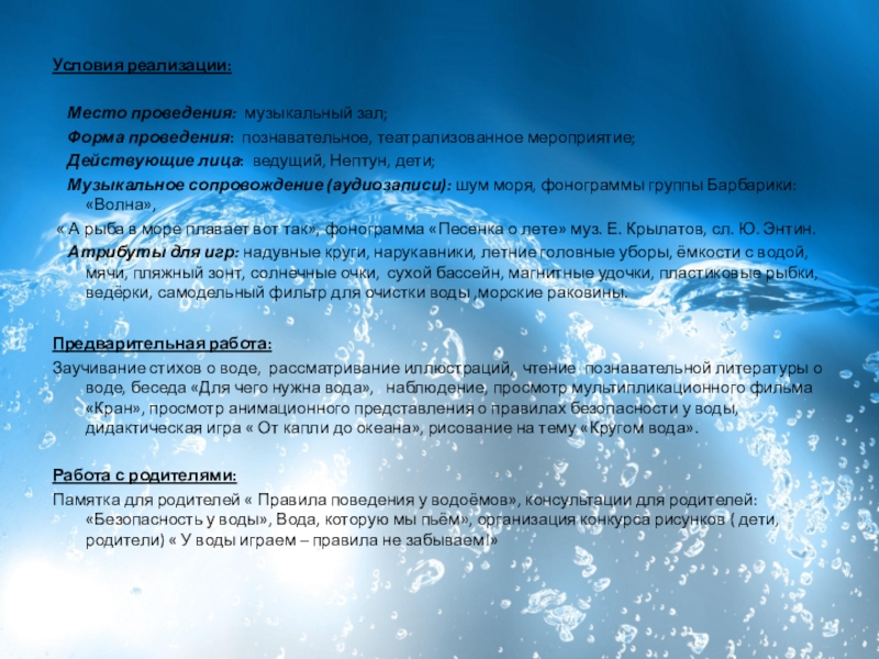 Заучивание стихов о воде, рассматривание иллюстраций, чтение познавательной литературы о воде, беседа «Для чего нужна вода», наблюдение, просмотр мультипликационного фильма «Кран», просмотр анимационного представления о правилах безопасности у воды, дидактическая игра « От капли до океана», рисование на тему «Кругом вода».
