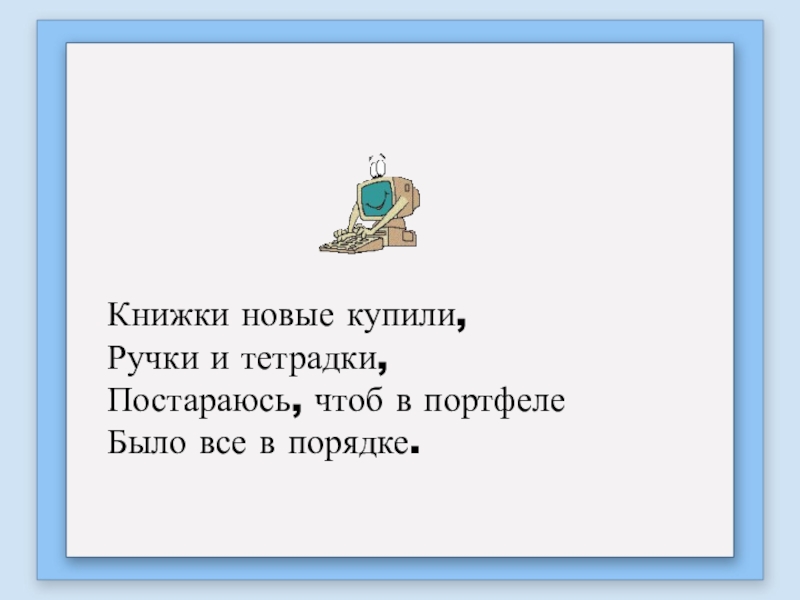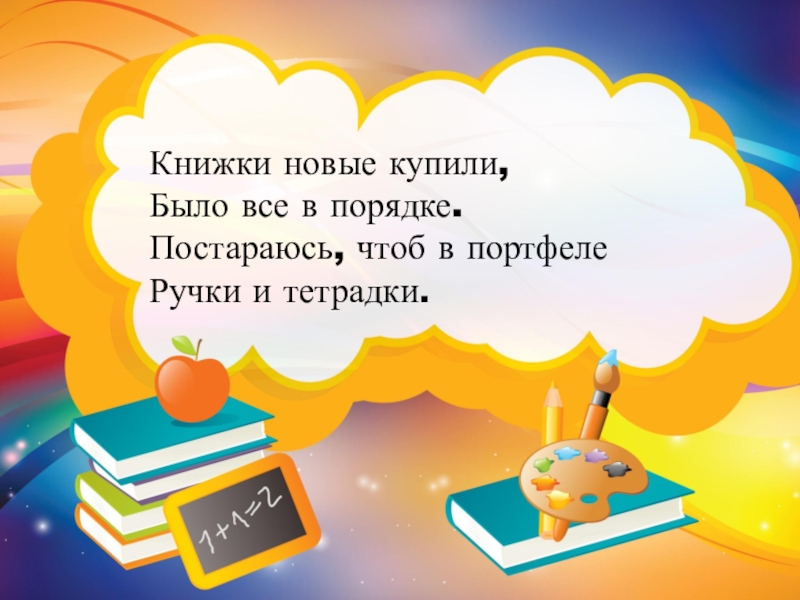 Книжки новые купили,Было все в порядке.Постараюсь, чтоб в портфелеРучки и тетрадки.