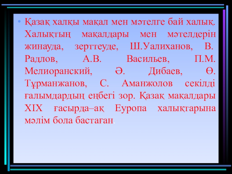 жинауда, зерттеуде, Ш.Уалиханов, В. Радлов, А.В. Васильев, П.М. Мелиоранский, Ә. Дибаев, Ө.Тұрманжанов, С. Аманжолов секілді ғалымдардың еңбегі зор. Қазақ мақалдары ХІХ ғасырда–ақ Еуропа халықтарына мәлім бола бастаған.