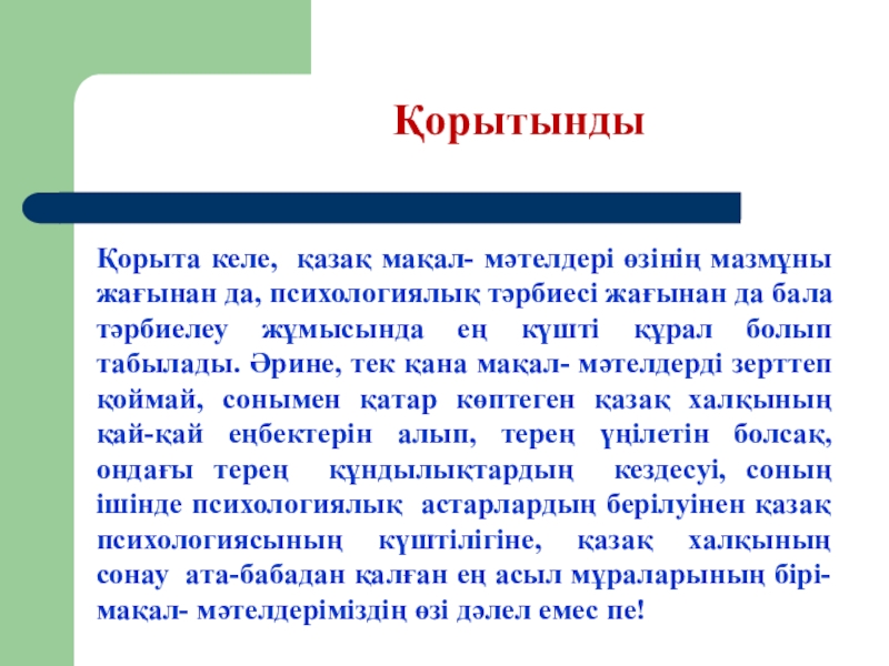 Слайд 38Қорыта келе, қазақ мақал- мәтелдері өзінің мазмұны жағынан да, психологиялық тәрбиесі