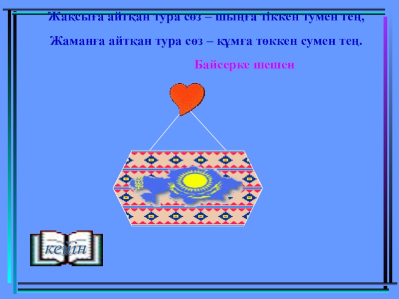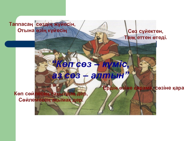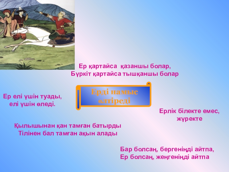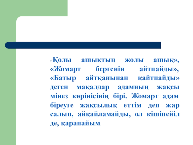 Слайд 26«Қолы ашықтың жолы ашық», «Жомарт бергенін айтпайды», «Батыр айтқанынан қайтпайды» деген