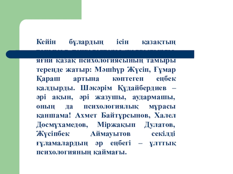 Слайд 7Кейін бұлардың ісін қазақтың танымал психологтары жалғастырды, яғни қазақ психологиясының тамыры