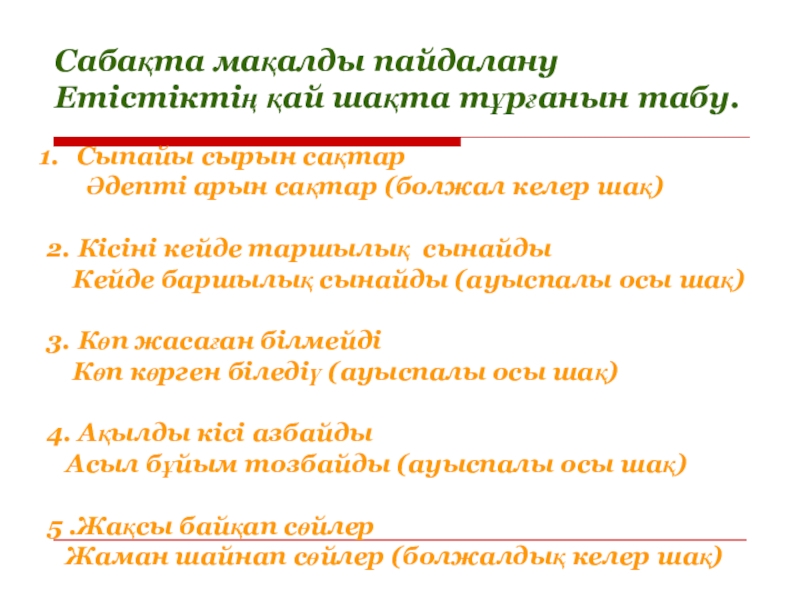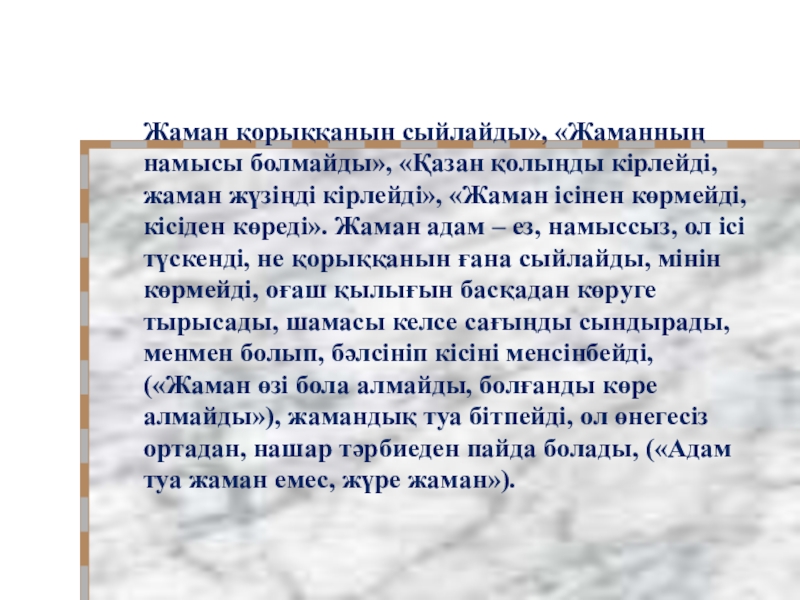 Слайд 30Жаман қорыққанын сыйлайды», «Жаманның намысы болмайды», «Қазан қолыңды кірлейді, жаман жүзіңді