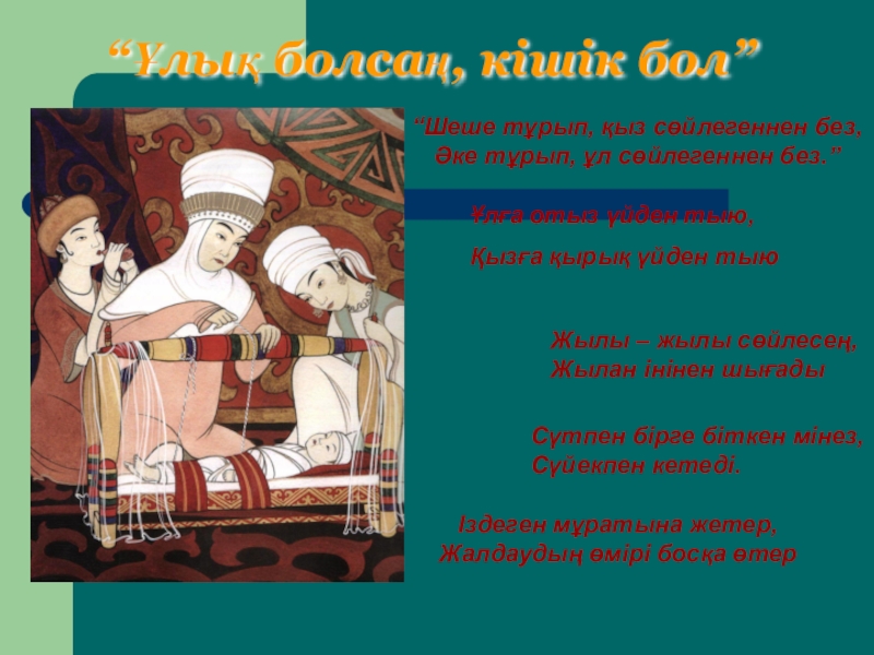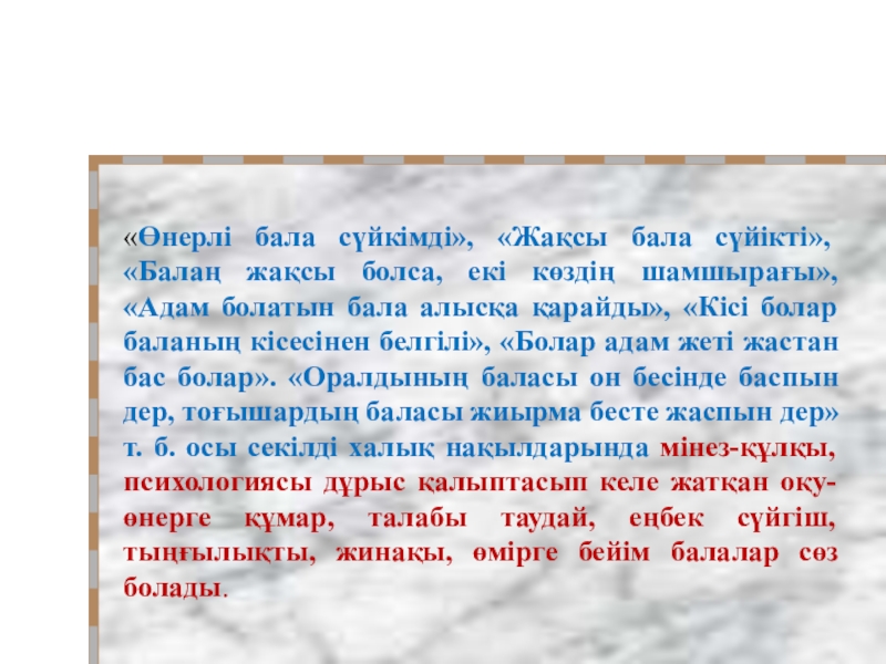 Слайд 32«Өнерлі бала сүйкімді», «Жақсы бала сүйікті», «Балаң жақсы болса, екі көздің