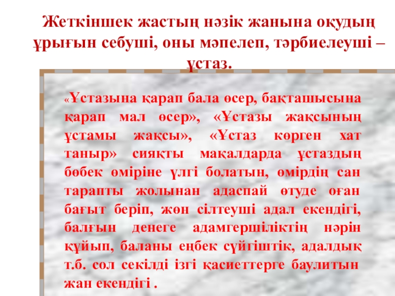 «Ұстазына қарап бала өсер, бақташысына қарап мал өсер», «Ұстазы жақсының ұстамы жақсы», «Ұстаз көрген хат таныр» сияқты мақалдарда ұстаздың бөбек өміріне үлгі болатын, өмірдің сан тарапты жолынан адаспай өтуде оған бағыт беріп, жөн сілтеуші адал екендігі, балғын денеге адамгершіліктің нәрін құйып, баланы еңбек сүйгіштік, адалдық т.б. сол секілді ізгі қасиеттерге баулитын жан екендігі .