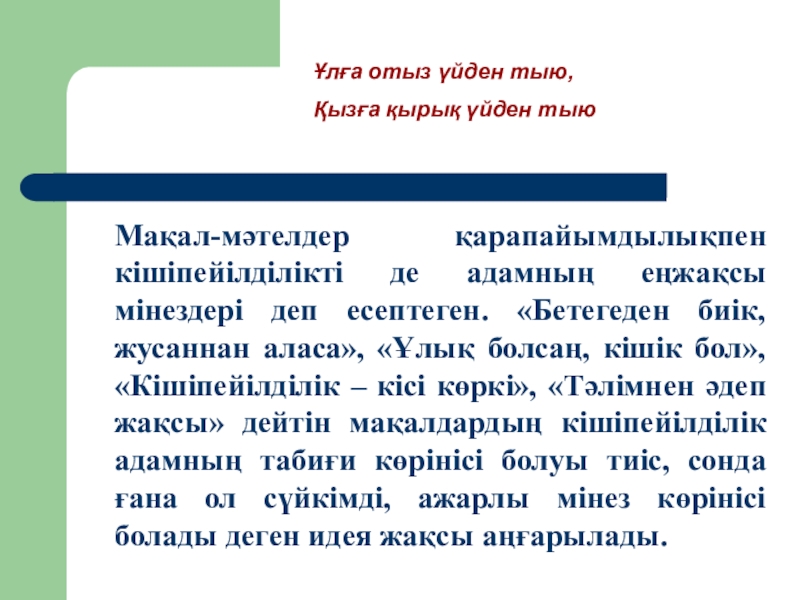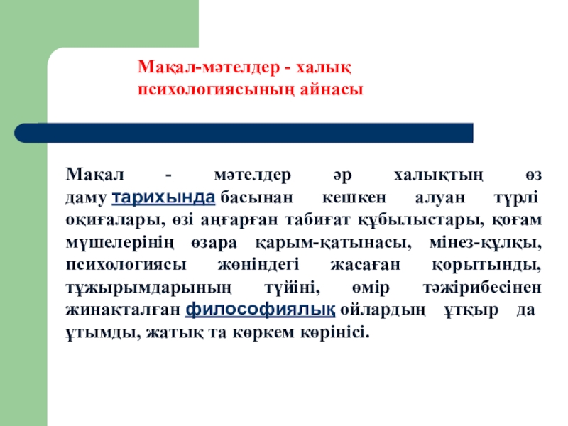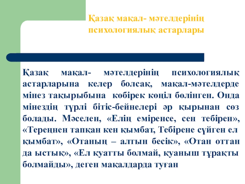 Слайд 19Қазақ мақал- мәтелдерінің психологиялық астарларына келер болсақ, мақал-мәтелдерде мінез тақырыбына көбірек