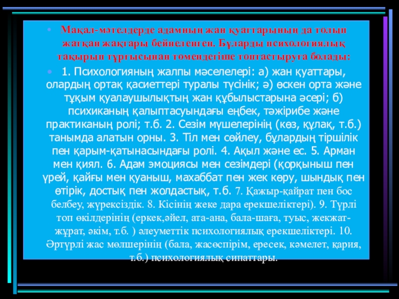 Слайд 11Мақал-мәтелдерде адамның жан қуаттарының да толып жатқан жақтары бейнеленген. Бұларды психологиялық