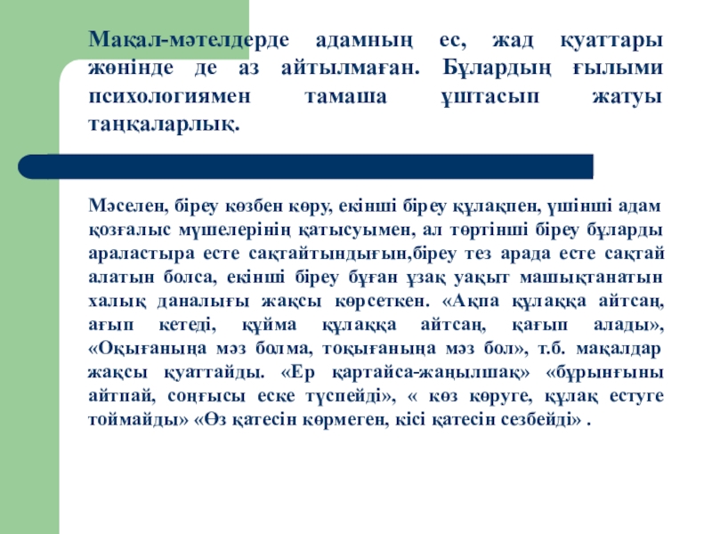 Слайд 14Мақал-мәтелдерде адамның ес, жад қуаттары жөнінде де аз айтылмаған. Бұлардың ғылыми