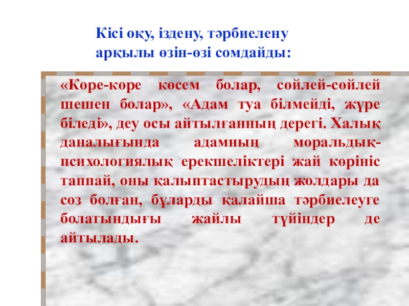 Слайд 35«Көре-көре көсем болар, сөйлей-сөйлей шешен болар», «Адам туа білмейді, жүре біледі»,